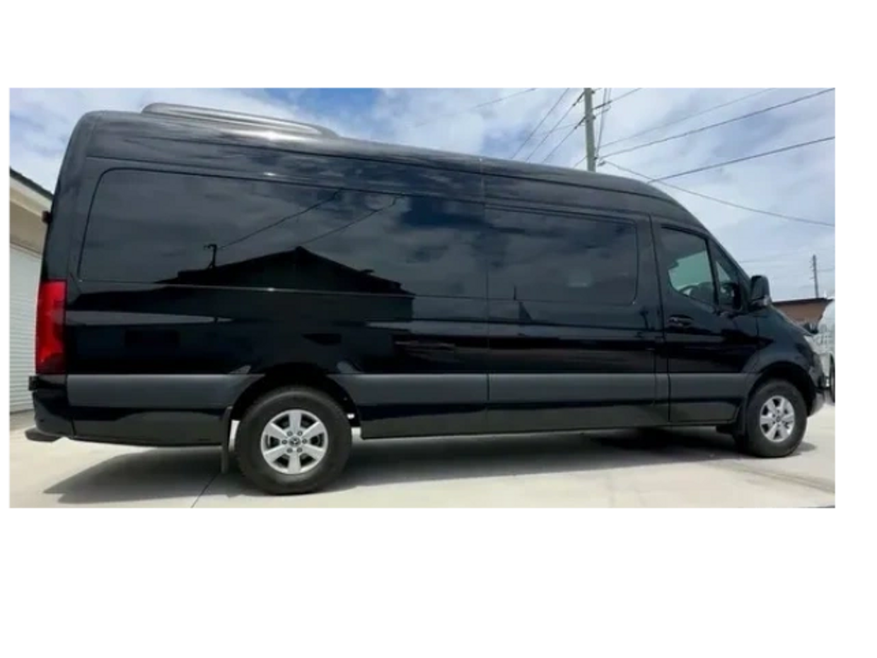 12 passenger Mercedes-Benz Sprinter van with extended trunk, black leather interior, electric step for easier access into van, navigation system, back up camera, Kenwood DVD front deck, 20 inch TV monitor, and USB ready for iPhone and Android mobile devices.